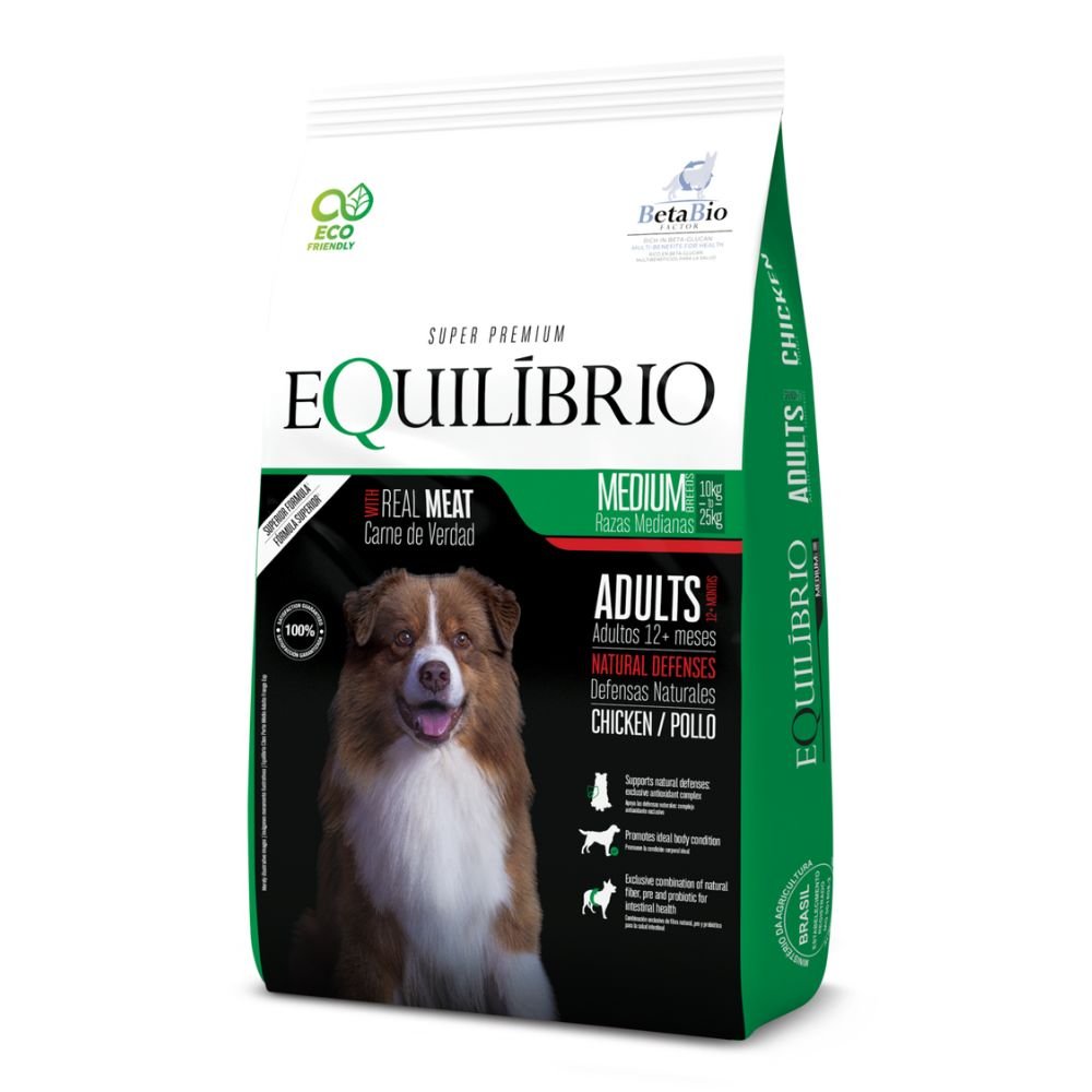 Equilibrio Adultos con Pollo para razas medianas es un alimento completo y balanceado para perros adultos de 10 a 25 kg. Contiene un complejo antioxidante exclusivo que refuerza las defensas naturales, favorece una condición corporal ideal y aporta beneficios digestivos gracias a su fórmula con fibra natural, prebióticos y probióticos.