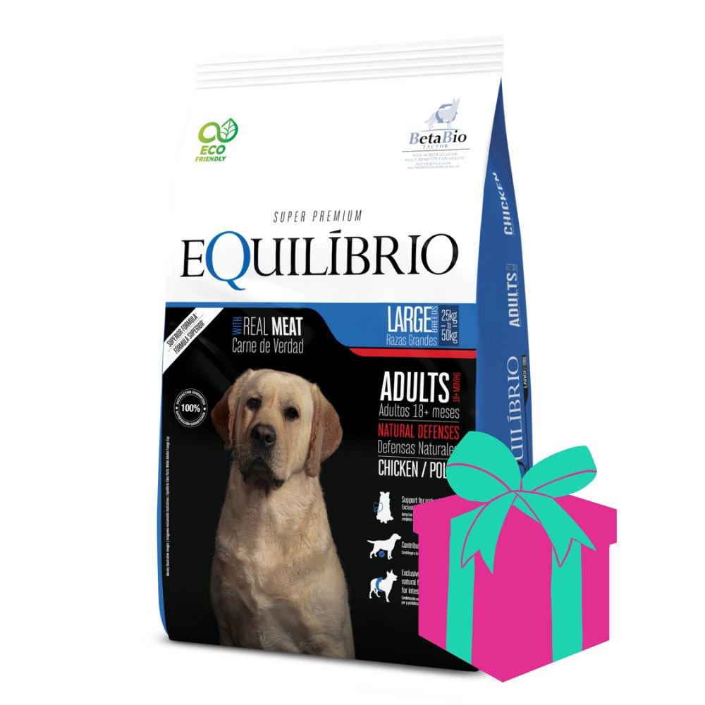 Equilibrio Adultos con Pollo para razas grandes es un alimento completo y balanceado, ideal para perros adultos de 25 a 50 kg. Contiene antioxidantes que fortalecen las defensas, nutrientes que cuidan las articulaciones y una mezcla funcional de fibras, prebióticos y probióticos para una digestión saludable.