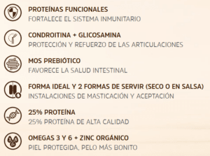 Harina de vísceras de pollo, harina de carne y huesos bovino, plasma de cerdo em polvo (1,5%), arroz, maíz molido*, harina de camote, harina de guisante, salvado de gluten de maíz, proteína concentrada de soya, salvado de trigo, grasa de pollo, aceite de pescados, levadura de caña de azúcar hidrolizada y deshidratada, extracto de Yucca schidigera (0,04%), manano-oligosacáridos (0,048%), hidrolizado a base de subproductos de pollo y cerdo, sulfato de glucosamina (0,05%), sulfato de condroitina (0,03%), cloruro de sodio, cloruro de potasio, DL-metionina, triptófano, vitamina A, vitamina D3, vitamina E, vitamina K3, vitamina B1, vitamina B2, vitamina B6, vitamina B12, vitamina C, niacina, cloruro de colina, ácido pantoténico, ácido fólico, biotina, yodato de calcio, sulfato de cobre, sulfato de hierro, levadura enriquecida con selenio, proteinato de manganeso, proteinato de zinc, propionato de calcio, extracto de pared de levadura, acidificante, antioxidantes (BHA y BHT), colorante caramelo IV.