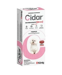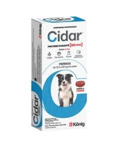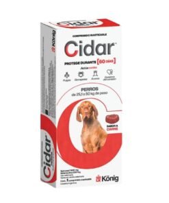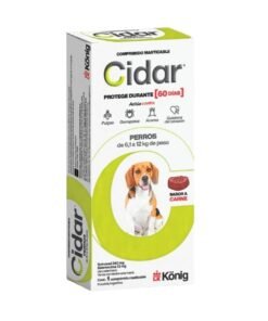 Cidar es el único comprimido antiparasitario externo con 60 días de protección. Actúa contra pulgas, garrapatas, ácaros, gusano del corazón. Comprimido masticable Cidar es un parasiticida externo sistémico para el tratamiento y prevención de infestaciones por pulgas, garrapatas, ácaros de la sarna sarcótica y otodéctica. Actúa de forma inmediata con alto poder de volteo y una alta residualidad de hasta 60 días.